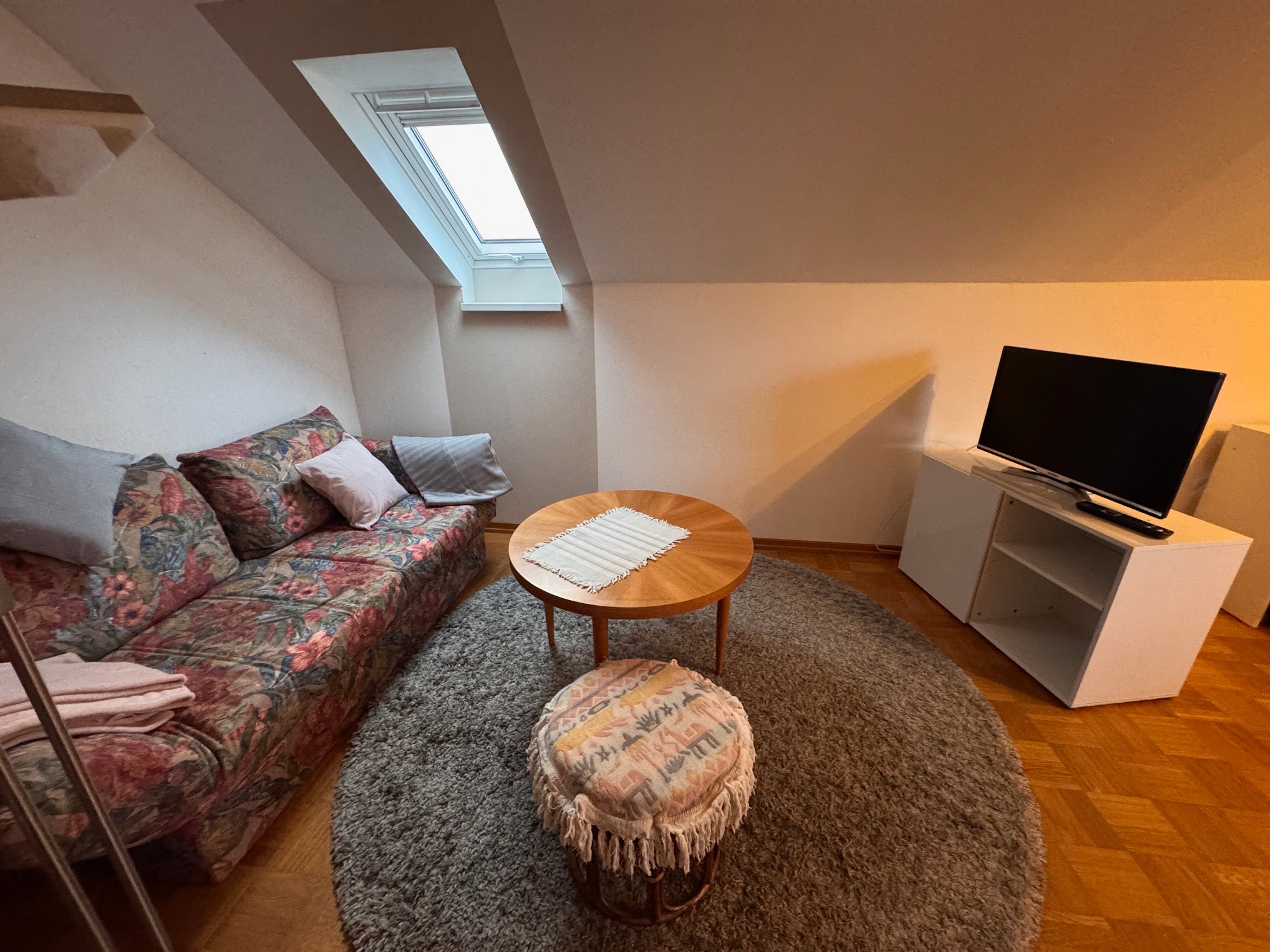 – Wohn- und Schlafbereich mit Couch, Couchtisch und  Einzelbett